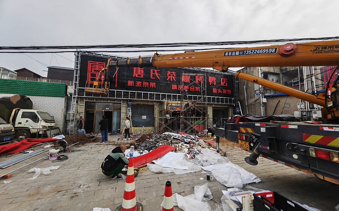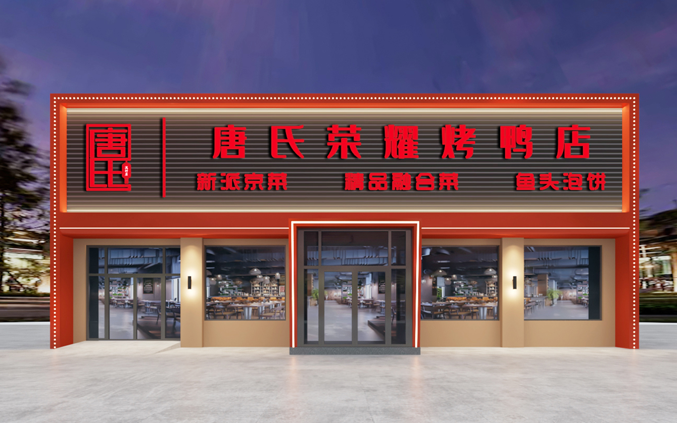 唐氏荣耀烤鸭店流村店门头设计施工,内部软装设计制作施工。